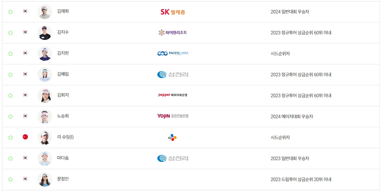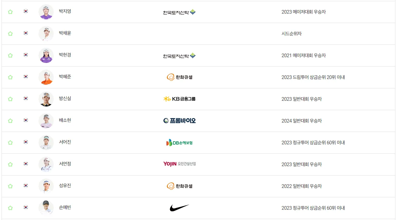 이전 챔피언 서연정 선수는 2024년 총 19회 대회 참여했고 top10에 2번정도 이름을 올렸습니다.컷통과 10번, 컷탈락 8번으로 성적이 오락가락하고 있는 가운데 kg 레이디스 오픈 대회에서 좋은 성적을 낼 수 있을지 한 번 지켜봐야겠습니다.