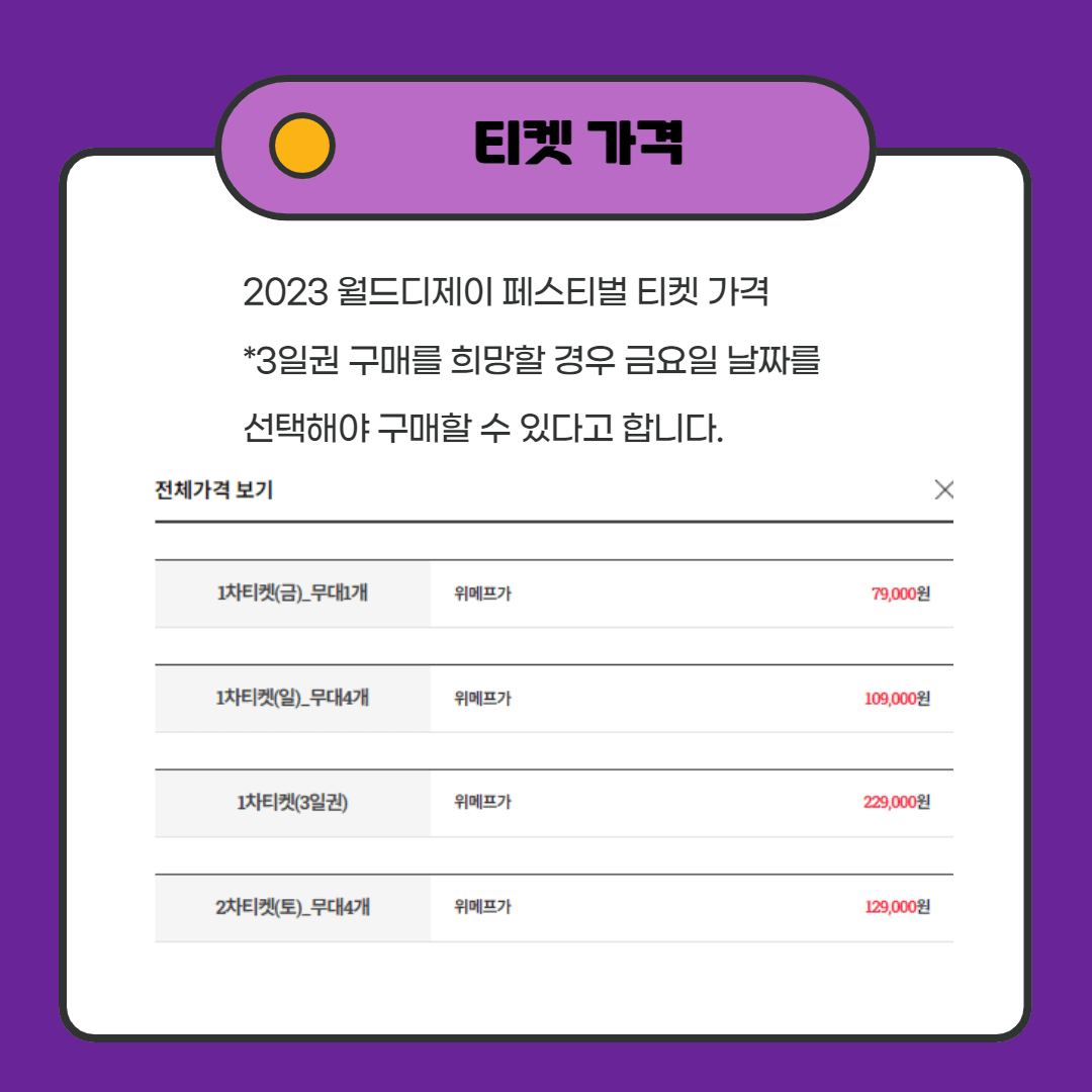 ■ 티켓 가격은 위메프 예약사이트 기준으로 다음과 같습니다. 현재 토요일 1차 티켓은 매진되어 토요일 하루권 희망할 경우 2차 티켓 가격으로 예매 가능합니다.
