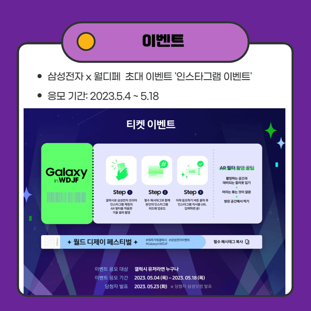 ■ 참여 방법 : 인스타그램에서 삼성전자 AR 필터 적용 후 셀피 촬여 > 필수 해시태그와 함께 업로드 > 업로드한 게시글 링크 남기면 완료