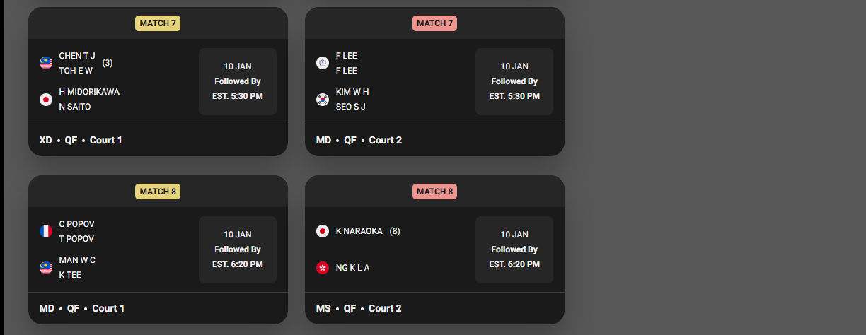 이번 경기에서는 여러 팀이 치열한 경쟁을 벌이며 승리와 패배를 겪었지만, 8강에 진출한 한국 팀들의 활약이 기대를 모으고 있습니다. 앞으로 남은 경기에서도 좋은 성적을 거두기를 응원합니다!