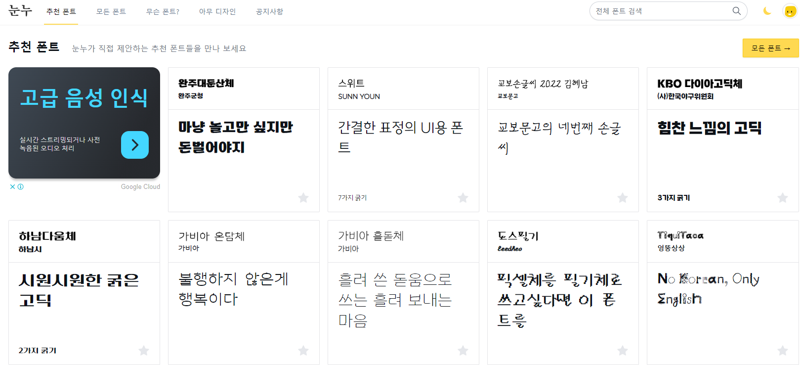 상업적 폰트를 한 곳에서 확인할 수 있는 눈누 사이트를 보여드릴게요~ 각 브랜드, 지역에서 출시한 폰트들을 여기서 쉽게 찾아볼 수 있는 게 큰 장점이에요. 또한 라이선스 범위도 상세 페이지에서 확인이 가능해서 일일이 폰트 저작권 범위를 찾이 않아도 되는 점도 아주 편리합니다.