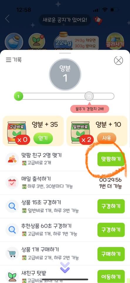 양동이는 30이 최대로 채워져서 틈틈이 양동이를 비워주면 좋아요. 그리고 미니게임에서 물풍선을 통해서 물 50~ 60정도 받아주시고, 상품 15초 보기, 추천상품 60초보기 통해서 비료를 추가로 받는 것도 챙겨주시면 좋습니다.