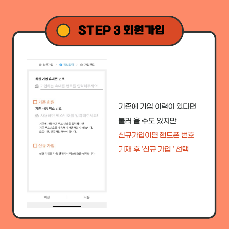 3. 만약 기존에 가입했지만 앱을 삭제한 경우라면 예전에 사용하던 번호를 불러서 사용할 수 있습니다. 하지만 신규가입이시라면 본인 휴대폰번호 기재 후 '신규가입' 선택하시면 됩니다.