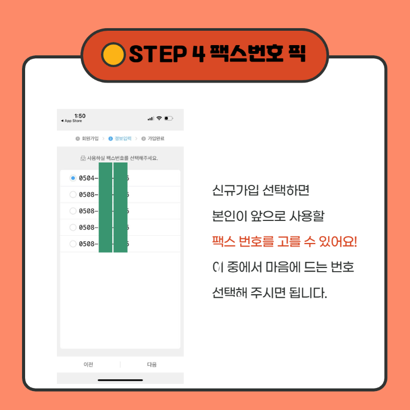 4.신규가입 선택하면 다음으로 앞으로 사용할 모바일팩스 번호를 선택할 수 있습니다. 후보 중에서 본인 마음에 드는 번호를 고르시고 다음 버튼을 눌러주세요.