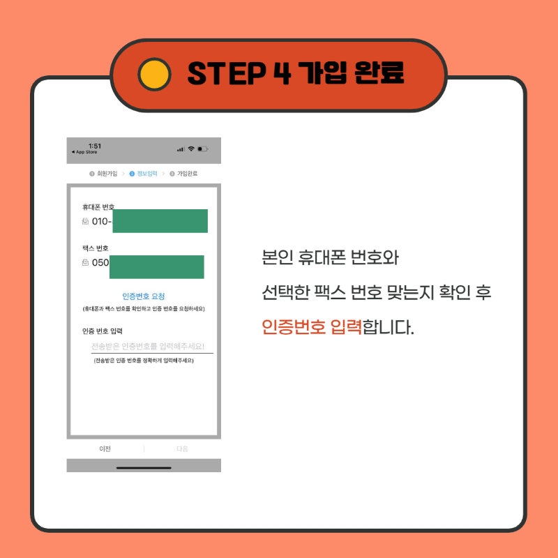 번호 선택까지 잘 따라와주셨으면 회원가입의 마지막 단계로 인증번호를 최종적으로 기재하면 회원가입완료됩니다.