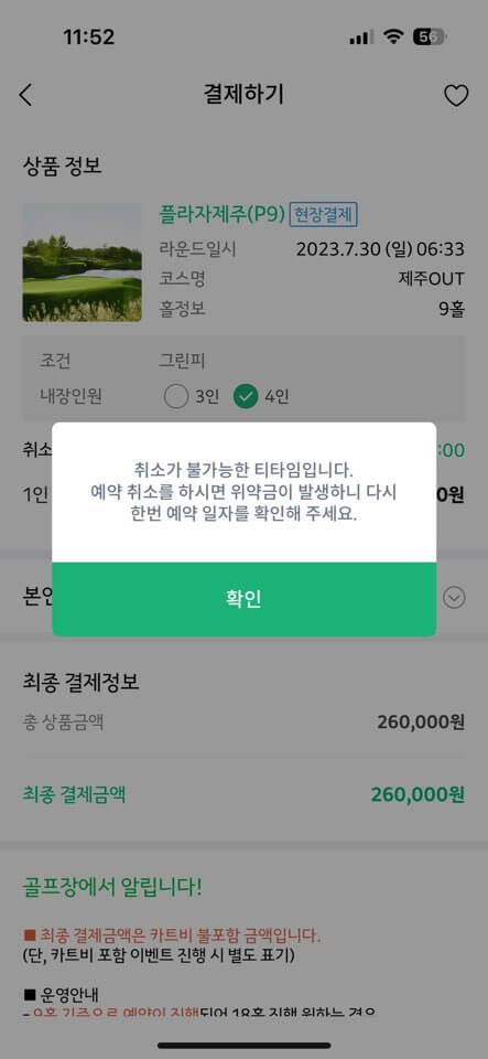 모든 조건을 확인하셨다면 결제를 진행합니다. 참고로 취소 불가능한 티타임인 경우 아래 이미지처럼 알림창이 뜨고 만약 예약 취소를 하게될 경우 위약금이 발생되니까 주의해 주세요!