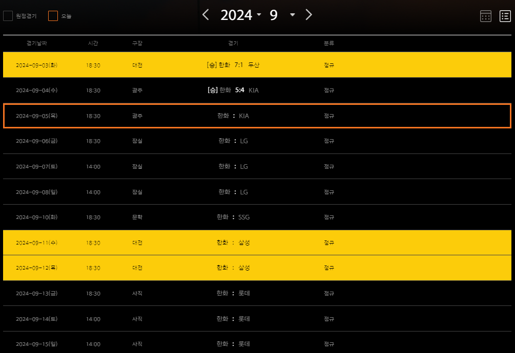 한화이글스 9월 전체 경기일정은 21개 경기가 있었고, 이중에서 홈경기는 7번 남은 상태입니다. 캘린더에서 노란색, 초록색, 빨간색 표기된 건 한화이글스 홈구장 구간별 요금을 의미합니다. 어제 기아홈에서 승리를 지켜낸 한화이글스 선수들! 오늘도 기아전이 18:30부터 시작되는데요 좋은 성적 거둬서 가을야구 갈 수 있었으면 좋겠습니다!!! 아직 희망이 있으니까요.5위 KT와 차이가 크지 않고 4위를 지켜고 있는 두산이 최근 하락세를 보이면서 앞으로 한화이글스 경기일정 결과도 중요하고, KT wiz 경기도 함께 지켜봐야할 거 같아요! 경기마다 달라지는 구단 순위도 바로 확인하실 수 있게 링크 남겨두겠습니다.