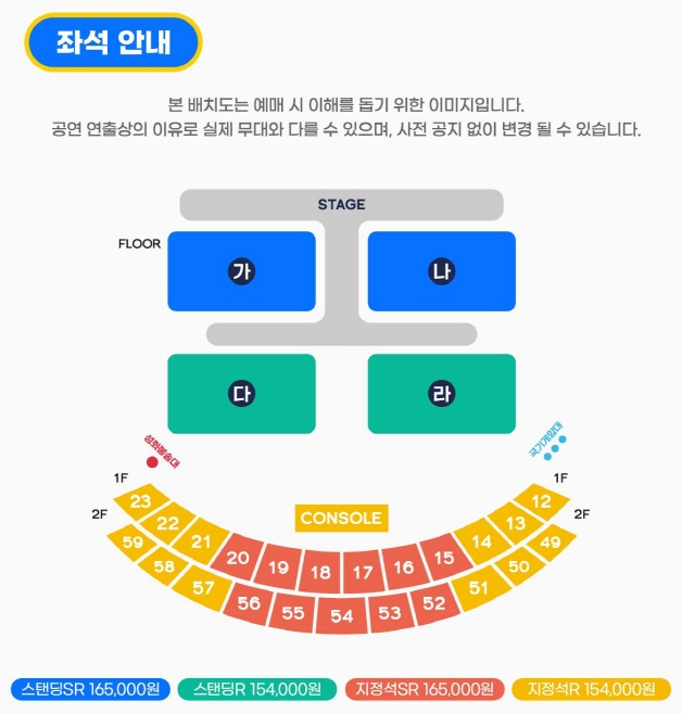 | 티켓 가격 | 스탠딩 165,000원 스탠딩 R 154,000원 지정석 SR 165,000원 지정석 154,000원 * 좌석확인 (바로가기) 혹은 아래 본문에서 좌석 배치도 확인할 수 있습니다. |