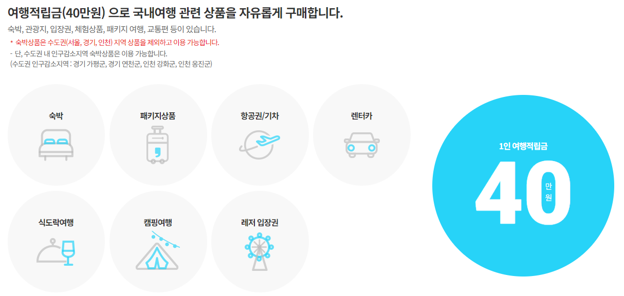 참여 근로자는 40만원 상당의 여행적립금을 받게 되며, 이는 숙박, 관광지 입장권, 교통편 예약 등 다양한 국내여행 상품 구매에 사용할 수 있습니다. 특히, 수도권 지역 상품을 제외한 전국의 다양한 숙박시설에서 사용 가능하며, 인구감소 지역의 숙박시설은 예외적으로 이용할 수 있습니다. 사용 카테고리별로 가능한 사이트도 바로 확인해 보세요!