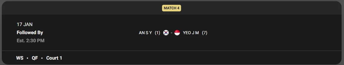 - 그녀는 지난 말레이시아 오픈 우승 후 이번 대회에서도 뛰어난 경기력을 보여주고 있습니다. 8강에서도 압도적인 경기를 기대하세요!