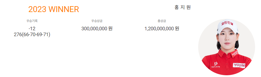 2023년 대회에서는 홍지원 선수가 최종합계 276타 12언더파를 기록하며 연장 2차전에서 극적인 버디로 우승을 차지했습니다. 이는 한화클래식 우승에 이어 또다시 메이저 대회를 석권한 것입니다. 이번 대회에서도 홍지원 선수의 활약이 기대됩니다.