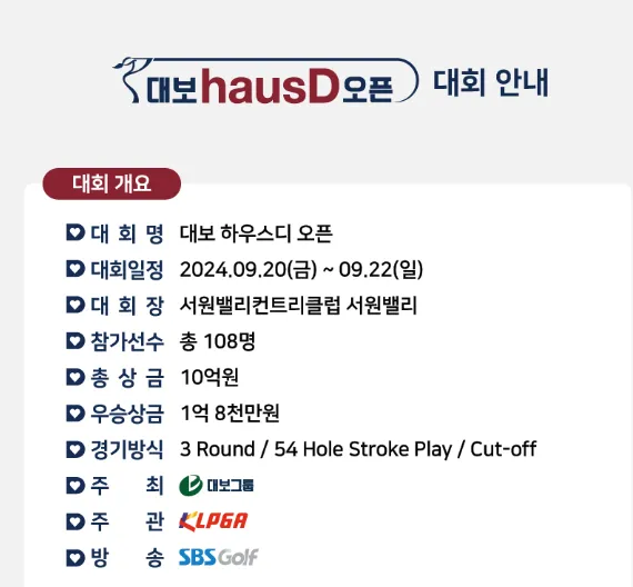 다음 KLPGA 경기는 9월 20일 대보 하우스 오픈이 시작됩니다. 현재 KLPGA 대보하우스 대회 갤러리 티켓 예매 가능하오니 갤러리 참석하실 분들은 미리 예약하시고 선착순 경품 정보까지 확인해서 받으시길 바랍니다 :)